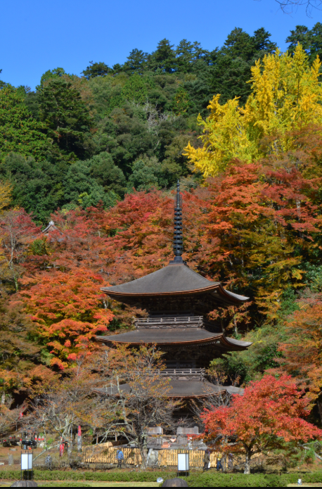 山笑う、山滴る、山粧う、山眠る。金剛院(こんごういん)の四季の移ろいは美しく、紅葉黄葉の季節はまた格別。関西花の寺第3番札所で多数の重要文化財を保有しており、開祖の高岳親王(たかおかしんのう)の遺徳を白河(しらかわ)天皇が追善供養したという国指定重要文化財の三重塔婆(永保3年[1083年]勅建)は、背後のモミジと調和し四季折々に美しくロマンを感じる景観です。歴史と紅葉をぜひ体感ください。