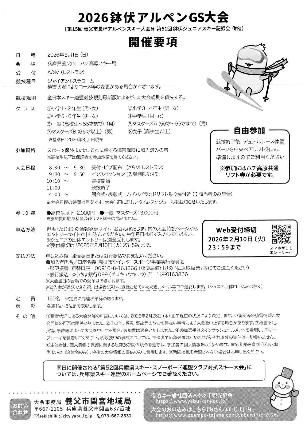 養父市長杯と鉢伏ジュニアスキー記録会とを同日開催します。競技種目はジャイアントスラローム。小学生からシニア、レース初心者の方から上級者まで、ぜひ皆様ご参加ください。