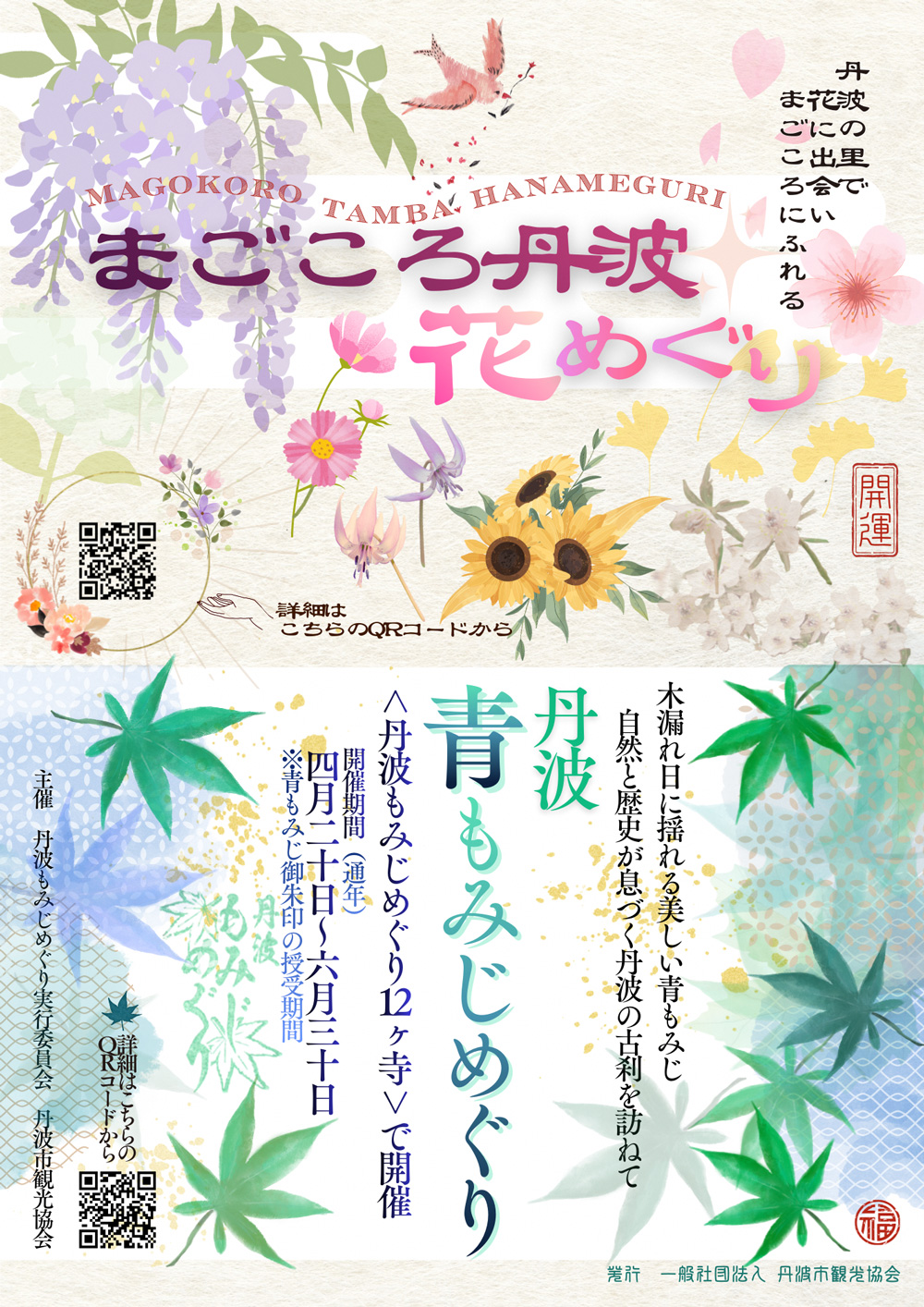 秋の紅葉だけじゃない!やわらかな木漏れ日の中で、新緑がきらめく期間限定企画「丹波青もみじめぐり」を開催します。期間中、市内12ヶ寺を舞台に、みずみずしい青もみじの美しさを楽しめます。各寺院では、この時期だけの特別な「青もみじ御朱印」も授与され、散策の思い出にぴったりです。