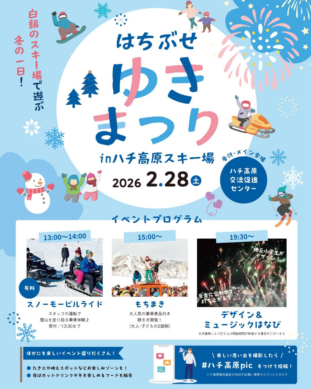 はちぶせ雪まつり エリア:養父市 カテゴリ:スキー / 体験 開催日:2026年02月28日 チ高原の冬の一大イベント『はちぶせ雪まつり』!豪華景品付き餅まき大会や夜には花火も開催予定。ぜひお越しください。 ・スノーモービルライド 13:00~14:00 ・餅まき 15:00~ ・花火 19:30~ 場 所:ハ…