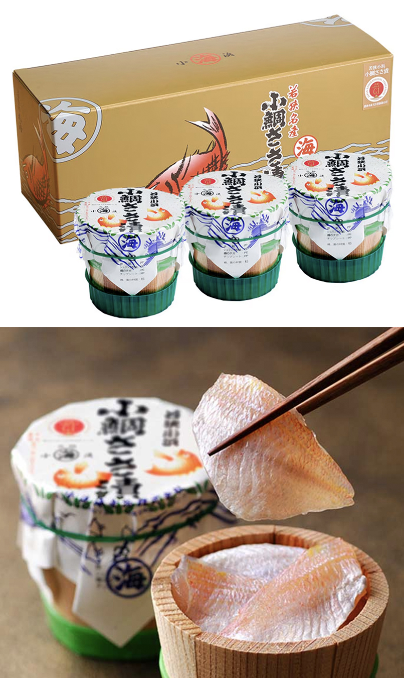 若狭湾に面した福井県小浜市は、古くから鯛漁が盛んな地域として知られています。 保存性を持ちながらも、お刺身に近い生のような風味を楽しめる「小鯛ささ漬」は、京の都でも重宝されてきました。 日本海産の小鯛を三枚におろし、塩を用いて下処理を行った後、酢に漬け込み、樽詰めなどにして仕上げられます。 「小鯛ささ漬」は明治期に製法が確立されたといわれており、鯛を三枚におろし、骨を丁寧に取り除く作業は機械化が難しく、産地の熟練した技能者の手仕事によって品質が支えられています。 皮目が淡いピンク色に美しく輝くその姿は見た目にも華やかで、小浜を代表する特産品として高い人気を誇っています。